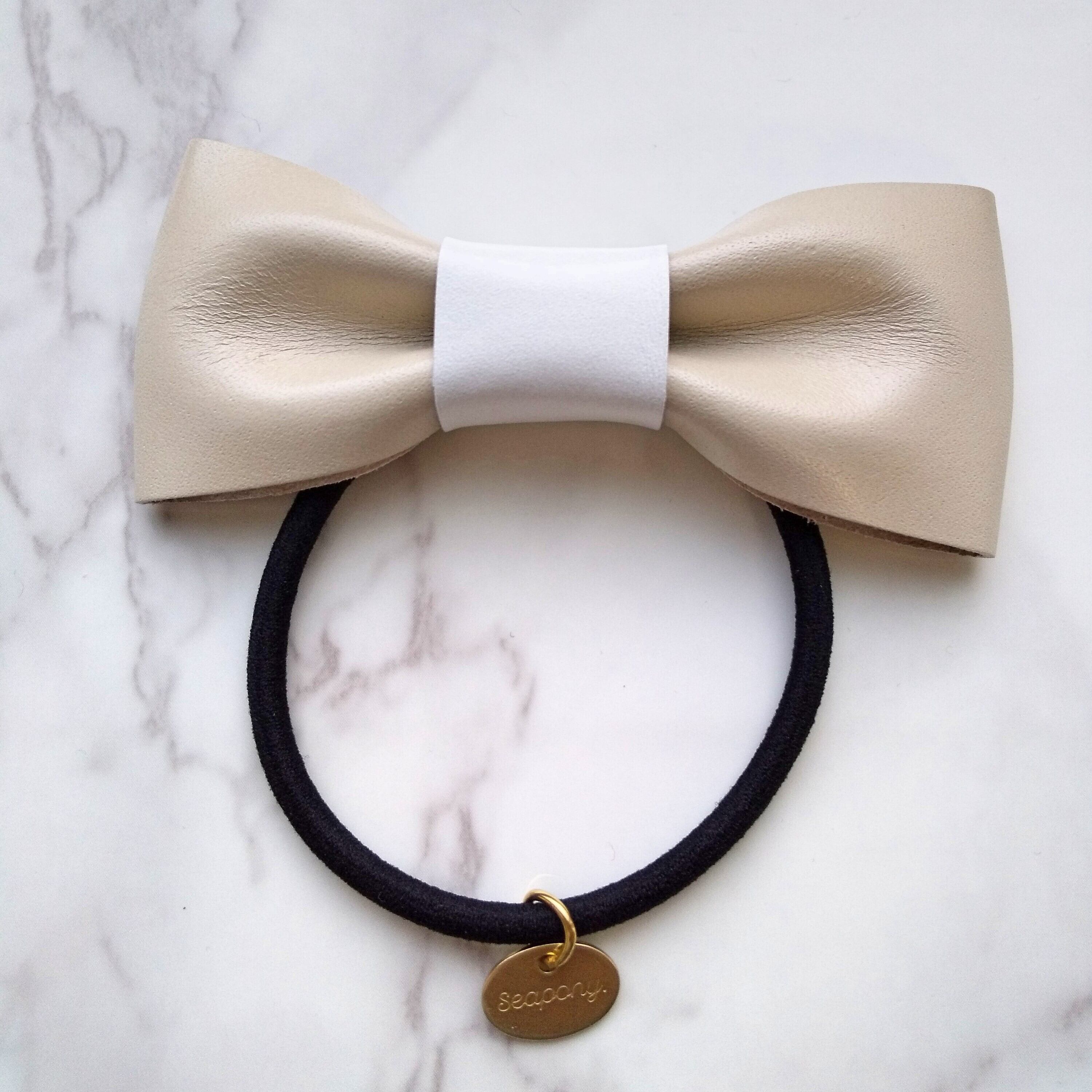 [ベージュ×ホワイト] レザーリボン ヘアゴム